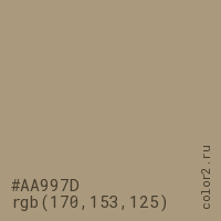 Цвет #AA997D в цветовой модели RGB обозначается тремя октетами (170, 153, 125) в десятичном формате и #AA997D в шестнадцатиричном (hex) формате, которые являются интенсивностью красного 170 (hex AA), интенсивность зелёного 153 (hex 99) и интенсивность синего 125 (hex 7D).