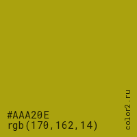 Цвет #AAA20E в цветовой модели RGB обозначается тремя октетами (170, 162, 14) в десятичном формате и #AAA20E в шестнадцатиричном (hex) формате, которые являются интенсивностью красного 170 (hex AA), интенсивность зелёного 162 (hex A2) и интенсивность синего 14 (hex 0E).