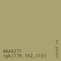 Цвет #AAA271 в цветовой модели RGB обозначается тремя октетами (170, 162, 113) в десятичном формате и #AAA271 в шестнадцатиричном (hex) формате, которые являются интенсивностью красного 170 (hex AA), интенсивность зелёного 162 (hex A2) и интенсивность синего 113 (hex 71).