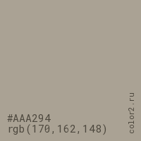 Цвет #AAA294 в цветовой модели RGB обозначается тремя октетами (170, 162, 148) в десятичном формате и #AAA294 в шестнадцатиричном (hex) формате, которые являются интенсивностью красного 170 (hex AA), интенсивность зелёного 162 (hex A2) и интенсивность синего 148 (hex 94).