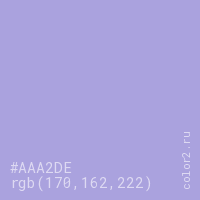 Цвет #AAA2DE в цветовой модели RGB обозначается тремя октетами (170, 162, 222) в десятичном формате и #AAA2DE в шестнадцатиричном (hex) формате, которые являются интенсивностью красного 170 (hex AA), интенсивность зелёного 162 (hex A2) и интенсивность синего 222 (hex DE).