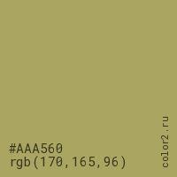 Цвет #AAA560 в цветовой модели RGB обозначается тремя октетами (170, 165, 96) в десятичном формате и #AAA560 в шестнадцатиричном (hex) формате, которые являются интенсивностью красного 170 (hex AA), интенсивность зелёного 165 (hex A5) и интенсивность синего 96 (hex 60).