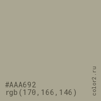 Цвет #AAA692 в цветовой модели RGB обозначается тремя октетами (170, 166, 146) в десятичном формате и #AAA692 в шестнадцатиричном (hex) формате, которые являются интенсивностью красного 170 (hex AA), интенсивность зелёного 166 (hex A6) и интенсивность синего 146 (hex 92).