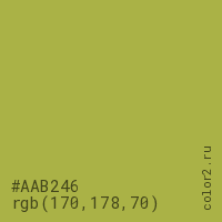 Цвет #AAB246 в цветовой модели RGB обозначается тремя октетами (170, 178, 70) в десятичном формате и #AAB246 в шестнадцатиричном (hex) формате, которые являются интенсивностью красного 170 (hex AA), интенсивность зелёного 178 (hex B2) и интенсивность синего 70 (hex 46).