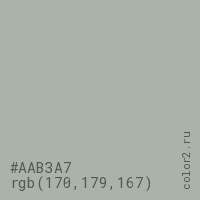 Цвет #AAB3A7 в цветовой модели RGB обозначается тремя октетами (170, 179, 167) в десятичном формате и #AAB3A7 в шестнадцатиричном (hex) формате, которые являются интенсивностью красного 170 (hex AA), интенсивность зелёного 179 (hex B3) и интенсивность синего 167 (hex A7).