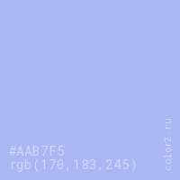 Цвет #AAB7F5 в цветовой модели RGB обозначается тремя октетами (170, 183, 245) в десятичном формате и #AAB7F5 в шестнадцатиричном (hex) формате, которые являются интенсивностью красного 170 (hex AA), интенсивность зелёного 183 (hex B7) и интенсивность синего 245 (hex F5).