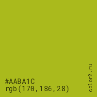 Цвет #AABA1C в цветовой модели RGB обозначается тремя октетами (170, 186, 28) в десятичном формате и #AABA1C в шестнадцатиричном (hex) формате, которые являются интенсивностью красного 170 (hex AA), интенсивность зелёного 186 (hex BA) и интенсивность синего 28 (hex 1C).