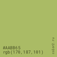 Цвет #AABB65 в цветовой модели RGB обозначается тремя октетами (170, 187, 101) в десятичном формате и #AABB65 в шестнадцатиричном (hex) формате, которые являются интенсивностью красного 170 (hex AA), интенсивность зелёного 187 (hex BB) и интенсивность синего 101 (hex 65).