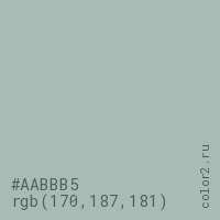 Цвет #AABBB5 в цветовой модели RGB обозначается тремя октетами (170, 187, 181) в десятичном формате и #AABBB5 в шестнадцатиричном (hex) формате, которые являются интенсивностью красного 170 (hex AA), интенсивность зелёного 187 (hex BB) и интенсивность синего 181 (hex B5).