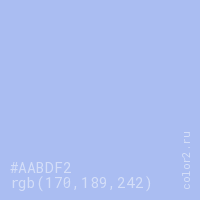 Цвет #AABDF2 в цветовой модели RGB обозначается тремя октетами (170, 189, 242) в десятичном формате и #AABDF2 в шестнадцатиричном (hex) формате, которые являются интенсивностью красного 170 (hex AA), интенсивность зелёного 189 (hex BD) и интенсивность синего 242 (hex F2).