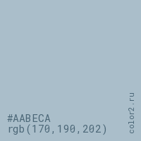 Цвет #AABECA в цветовой модели RGB обозначается тремя октетами (170, 190, 202) в десятичном формате и #AABECA в шестнадцатиричном (hex) формате, которые являются интенсивностью красного 170 (hex AA), интенсивность зелёного 190 (hex BE) и интенсивность синего 202 (hex CA).