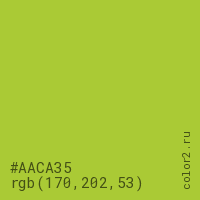 Цвет #AACA35 в цветовой модели RGB обозначается тремя октетами (170, 202, 53) в десятичном формате и #AACA35 в шестнадцатиричном (hex) формате, которые являются интенсивностью красного 170 (hex AA), интенсивность зелёного 202 (hex CA) и интенсивность синего 53 (hex 35).