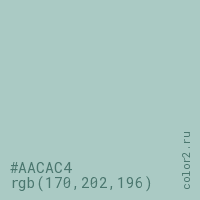 Цвет #AACAC4 в цветовой модели RGB обозначается тремя октетами (170, 202, 196) в десятичном формате и #AACAC4 в шестнадцатиричном (hex) формате, которые являются интенсивностью красного 170 (hex AA), интенсивность зелёного 202 (hex CA) и интенсивность синего 196 (hex C4).