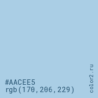 Цвет #AACEE5 в цветовой модели RGB обозначается тремя октетами (170, 206, 229) в десятичном формате и #AACEE5 в шестнадцатиричном (hex) формате, которые являются интенсивностью красного 170 (hex AA), интенсивность зелёного 206 (hex CE) и интенсивность синего 229 (hex E5).