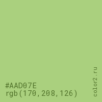 Цвет #AAD07E в цветовой модели RGB обозначается тремя октетами (170, 208, 126) в десятичном формате и #AAD07E в шестнадцатиричном (hex) формате, которые являются интенсивностью красного 170 (hex AA), интенсивность зелёного 208 (hex D0) и интенсивность синего 126 (hex 7E).