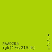 Цвет #AAD205 в цветовой модели RGB обозначается тремя октетами (170, 210, 5) в десятичном формате и #AAD205 в шестнадцатиричном (hex) формате, которые являются интенсивностью красного 170 (hex AA), интенсивность зелёного 210 (hex D2) и интенсивность синего 5 (hex 05).