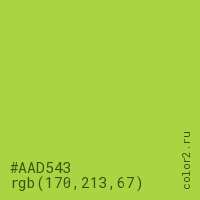 Цвет #AAD543 в цветовой модели RGB обозначается тремя октетами (170, 213, 67) в десятичном формате и #AAD543 в шестнадцатиричном (hex) формате, которые являются интенсивностью красного 170 (hex AA), интенсивность зелёного 213 (hex D5) и интенсивность синего 67 (hex 43).