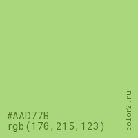 Цвет #AAD77B в цветовой модели RGB обозначается тремя октетами (170, 215, 123) в десятичном формате и #AAD77B в шестнадцатиричном (hex) формате, которые являются интенсивностью красного 170 (hex AA), интенсивность зелёного 215 (hex D7) и интенсивность синего 123 (hex 7B).