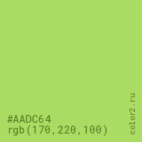 Цвет #AADC64 в цветовой модели RGB обозначается тремя октетами (170, 220, 100) в десятичном формате и #AADC64 в шестнадцатиричном (hex) формате, которые являются интенсивностью красного 170 (hex AA), интенсивность зелёного 220 (hex DC) и интенсивность синего 100 (hex 64).