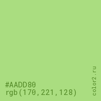 Цвет #AADD80 в цветовой модели RGB обозначается тремя октетами (170, 221, 128) в десятичном формате и #AADD80 в шестнадцатиричном (hex) формате, которые являются интенсивностью красного 170 (hex AA), интенсивность зелёного 221 (hex DD) и интенсивность синего 128 (hex 80).