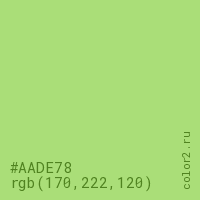 Цвет #AADE78 в цветовой модели RGB обозначается тремя октетами (170, 222, 120) в десятичном формате и #AADE78 в шестнадцатиричном (hex) формате, которые являются интенсивностью красного 170 (hex AA), интенсивность зелёного 222 (hex DE) и интенсивность синего 120 (hex 78).