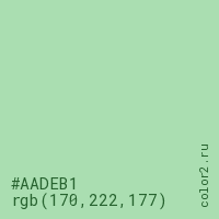 Цвет #AADEB1 в цветовой модели RGB обозначается тремя октетами (170, 222, 177) в десятичном формате и #AADEB1 в шестнадцатиричном (hex) формате, которые являются интенсивностью красного 170 (hex AA), интенсивность зелёного 222 (hex DE) и интенсивность синего 177 (hex B1).
