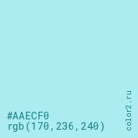Цвет #AAECF0 в цветовой модели RGB обозначается тремя октетами (170, 236, 240) в десятичном формате и #AAECF0 в шестнадцатиричном (hex) формате, которые являются интенсивностью красного 170 (hex AA), интенсивность зелёного 236 (hex EC) и интенсивность синего 240 (hex F0).