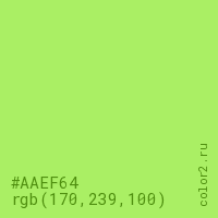 Цвет #AAEF64 в цветовой модели RGB обозначается тремя октетами (170, 239, 100) в десятичном формате и #AAEF64 в шестнадцатиричном (hex) формате, которые являются интенсивностью красного 170 (hex AA), интенсивность зелёного 239 (hex EF) и интенсивность синего 100 (hex 64).