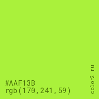 Цвет #AAF13B в цветовой модели RGB обозначается тремя октетами (170, 241, 59) в десятичном формате и #AAF13B в шестнадцатиричном (hex) формате, которые являются интенсивностью красного 170 (hex AA), интенсивность зелёного 241 (hex F1) и интенсивность синего 59 (hex 3B).