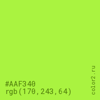 Цвет #AAF340 в цветовой модели RGB обозначается тремя октетами (170, 243, 64) в десятичном формате и #AAF340 в шестнадцатиричном (hex) формате, которые являются интенсивностью красного 170 (hex AA), интенсивность зелёного 243 (hex F3) и интенсивность синего 64 (hex 40).