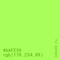 Цвет #AAFE59 в цветовой модели RGB обозначается тремя октетами (170, 254, 89) в десятичном формате и #AAFE59 в шестнадцатиричном (hex) формате, которые являются интенсивностью красного 170 (hex AA), интенсивность зелёного 254 (hex FE) и интенсивность синего 89 (hex 59).