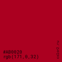Цвет #AB0020 в цветовой модели RGB обозначается тремя октетами (171, 0, 32) в десятичном формате и #AB0020 в шестнадцатиричном (hex) формате, которые являются интенсивностью красного 171 (hex AB), интенсивность зелёного 0 (hex 00) и интенсивность синего 32 (hex 20).