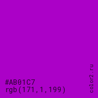 Цвет #AB01C7 в цветовой модели RGB обозначается тремя октетами (171, 1, 199) в десятичном формате и #AB01C7 в шестнадцатиричном (hex) формате, которые являются интенсивностью красного 171 (hex AB), интенсивность зелёного 1 (hex 01) и интенсивность синего 199 (hex C7).