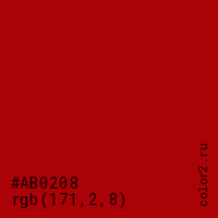 Цвет #AB0208 в цветовой модели RGB обозначается тремя октетами (171, 2, 8) в десятичном формате и #AB0208 в шестнадцатиричном (hex) формате, которые являются интенсивностью красного 171 (hex AB), интенсивность зелёного 2 (hex 02) и интенсивность синего 8 (hex 08).