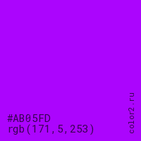 Цвет #AB05FD в цветовой модели RGB обозначается тремя октетами (171, 5, 253) в десятичном формате и #AB05FD в шестнадцатиричном (hex) формате, которые являются интенсивностью красного 171 (hex AB), интенсивность зелёного 5 (hex 05) и интенсивность синего 253 (hex FD).