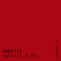 Цвет #AB0713 в цветовой модели RGB обозначается тремя октетами (171, 7, 19) в десятичном формате и #AB0713 в шестнадцатиричном (hex) формате, которые являются интенсивностью красного 171 (hex AB), интенсивность зелёного 7 (hex 07) и интенсивность синего 19 (hex 13).