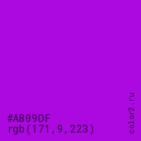 Цвет #AB09DF в цветовой модели RGB обозначается тремя октетами (171, 9, 223) в десятичном формате и #AB09DF в шестнадцатиричном (hex) формате, которые являются интенсивностью красного 171 (hex AB), интенсивность зелёного 9 (hex 09) и интенсивность синего 223 (hex DF).