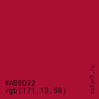 Цвет #AB0D32 в цветовой модели RGB обозначается тремя октетами (171, 13, 50) в десятичном формате и #AB0D32 в шестнадцатиричном (hex) формате, которые являются интенсивностью красного 171 (hex AB), интенсивность зелёного 13 (hex 0D) и интенсивность синего 50 (hex 32).