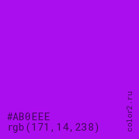 Цвет #AB0EEE в цветовой модели RGB обозначается тремя октетами (171, 14, 238) в десятичном формате и #AB0EEE в шестнадцатиричном (hex) формате, которые являются интенсивностью красного 171 (hex AB), интенсивность зелёного 14 (hex 0E) и интенсивность синего 238 (hex EE).