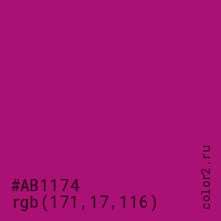 Цвет #AB1174 в цветовой модели RGB обозначается тремя октетами (171, 17, 116) в десятичном формате и #AB1174 в шестнадцатиричном (hex) формате, которые являются интенсивностью красного 171 (hex AB), интенсивность зелёного 17 (hex 11) и интенсивность синего 116 (hex 74).