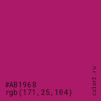 Цвет #AB1968 в цветовой модели RGB обозначается тремя октетами (171, 25, 104) в десятичном формате и #AB1968 в шестнадцатиричном (hex) формате, которые являются интенсивностью красного 171 (hex AB), интенсивность зелёного 25 (hex 19) и интенсивность синего 104 (hex 68).