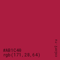 Цвет #AB1C40 в цветовой модели RGB обозначается тремя октетами (171, 28, 64) в десятичном формате и #AB1C40 в шестнадцатиричном (hex) формате, которые являются интенсивностью красного 171 (hex AB), интенсивность зелёного 28 (hex 1C) и интенсивность синего 64 (hex 40).