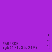 Цвет #AB23DB в цветовой модели RGB обозначается тремя октетами (171, 35, 219) в десятичном формате и #AB23DB в шестнадцатиричном (hex) формате, которые являются интенсивностью красного 171 (hex AB), интенсивность зелёного 35 (hex 23) и интенсивность синего 219 (hex DB).