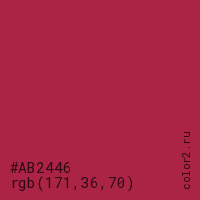 Цвет #AB2446 в цветовой модели RGB обозначается тремя октетами (171, 36, 70) в десятичном формате и #AB2446 в шестнадцатиричном (hex) формате, которые являются интенсивностью красного 171 (hex AB), интенсивность зелёного 36 (hex 24) и интенсивность синего 70 (hex 46).