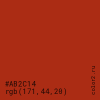 Цвет #AB2C14 в цветовой модели RGB обозначается тремя октетами (171, 44, 20) в десятичном формате и #AB2C14 в шестнадцатиричном (hex) формате, которые являются интенсивностью красного 171 (hex AB), интенсивность зелёного 44 (hex 2C) и интенсивность синего 20 (hex 14).