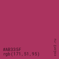 Цвет #AB335F в цветовой модели RGB обозначается тремя октетами (171, 51, 95) в десятичном формате и #AB335F в шестнадцатиричном (hex) формате, которые являются интенсивностью красного 171 (hex AB), интенсивность зелёного 51 (hex 33) и интенсивность синего 95 (hex 5F).