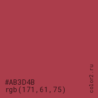 Цвет #AB3D4B в цветовой модели RGB обозначается тремя октетами (171, 61, 75) в десятичном формате и #AB3D4B в шестнадцатиричном (hex) формате, которые являются интенсивностью красного 171 (hex AB), интенсивность зелёного 61 (hex 3D) и интенсивность синего 75 (hex 4B).