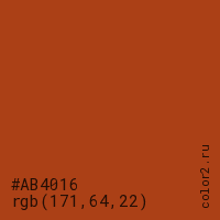 Цвет #AB4016 в цветовой модели RGB обозначается тремя октетами (171, 64, 22) в десятичном формате и #AB4016 в шестнадцатиричном (hex) формате, которые являются интенсивностью красного 171 (hex AB), интенсивность зелёного 64 (hex 40) и интенсивность синего 22 (hex 16).