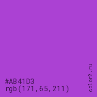 Цвет #AB41D3 в цветовой модели RGB обозначается тремя октетами (171, 65, 211) в десятичном формате и #AB41D3 в шестнадцатиричном (hex) формате, которые являются интенсивностью красного 171 (hex AB), интенсивность зелёного 65 (hex 41) и интенсивность синего 211 (hex D3).