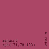 Цвет #AB4667 в цветовой модели RGB обозначается тремя октетами (171, 70, 103) в десятичном формате и #AB4667 в шестнадцатиричном (hex) формате, которые являются интенсивностью красного 171 (hex AB), интенсивность зелёного 70 (hex 46) и интенсивность синего 103 (hex 67).